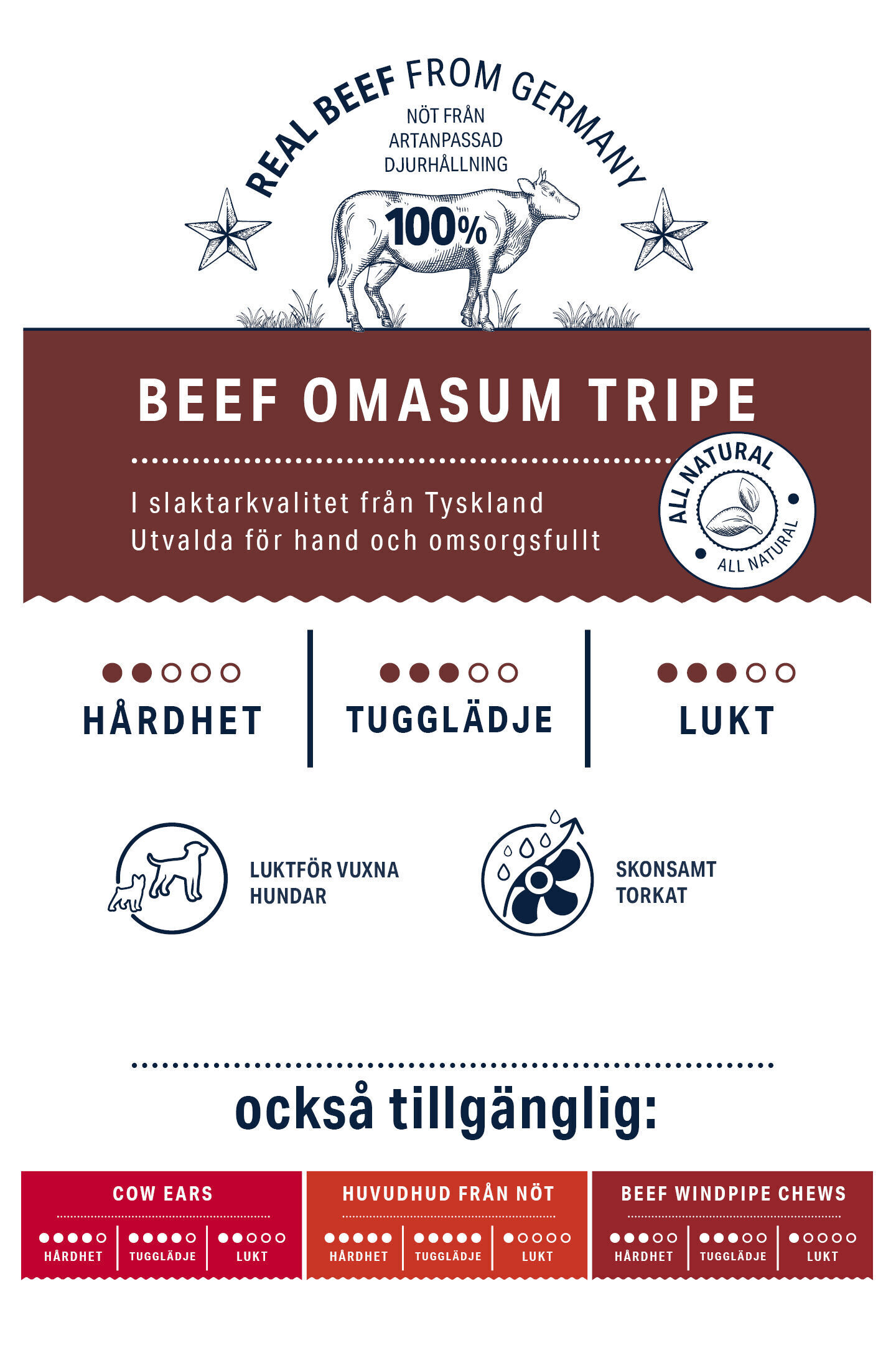 Vommen kommer från nötkreatur som hålls under artanpassade förhållanden, är naturligt fri från spannmål och socker och torkas skonsamt utan konserveringsmedel.
