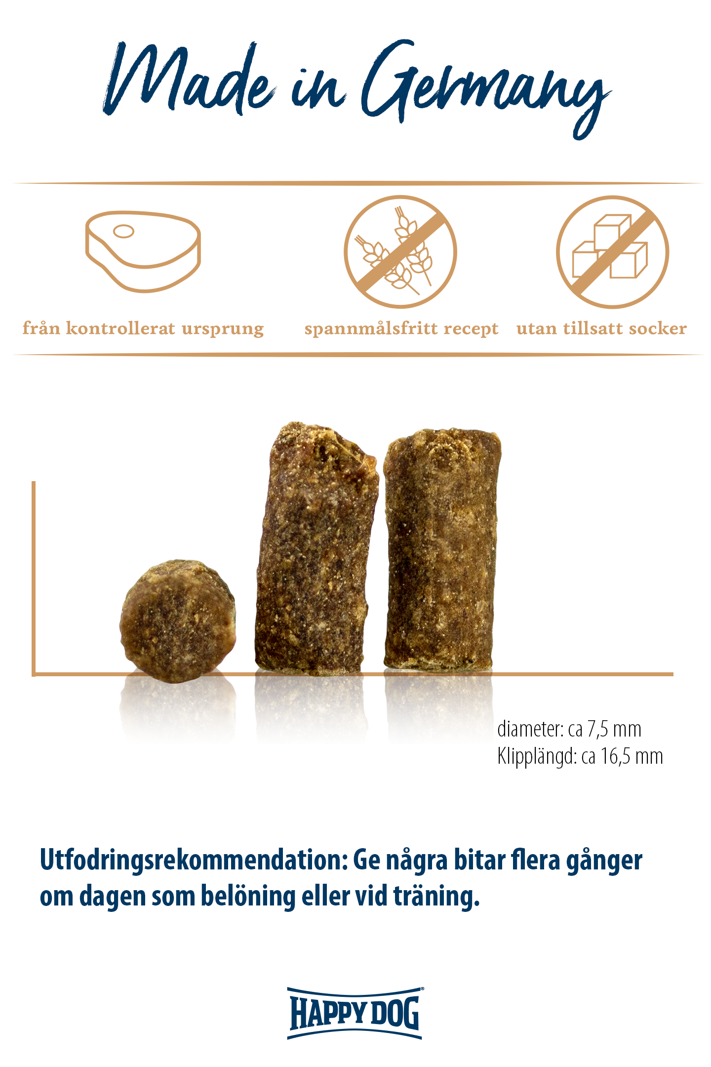 Det spannmålsfria receptet med glutenfri potatis är idealiskt för känsliga och anspråksfulla hundar i alla storlekar och rekommenderas av veterinärer vid foderintolerans. Snacksen är lätta att dela och är därför idealiska för träning eller bara som belöning lite nu och då. Snacksen tillverkas utan tillsats av socker eller konserveringsmedel och påsen har en praktisk återförslutning så att snacksen håller sig färska länge. För oss är ett hållbart, ansvarsfullt agerande och bästa kvalitet mycket viktiga, därför kommer köttet till våra Meat Snacks från mycket bra uppfödning i Tyskland, har kortast möjliga transportvägar och bearbetas skonsamt.