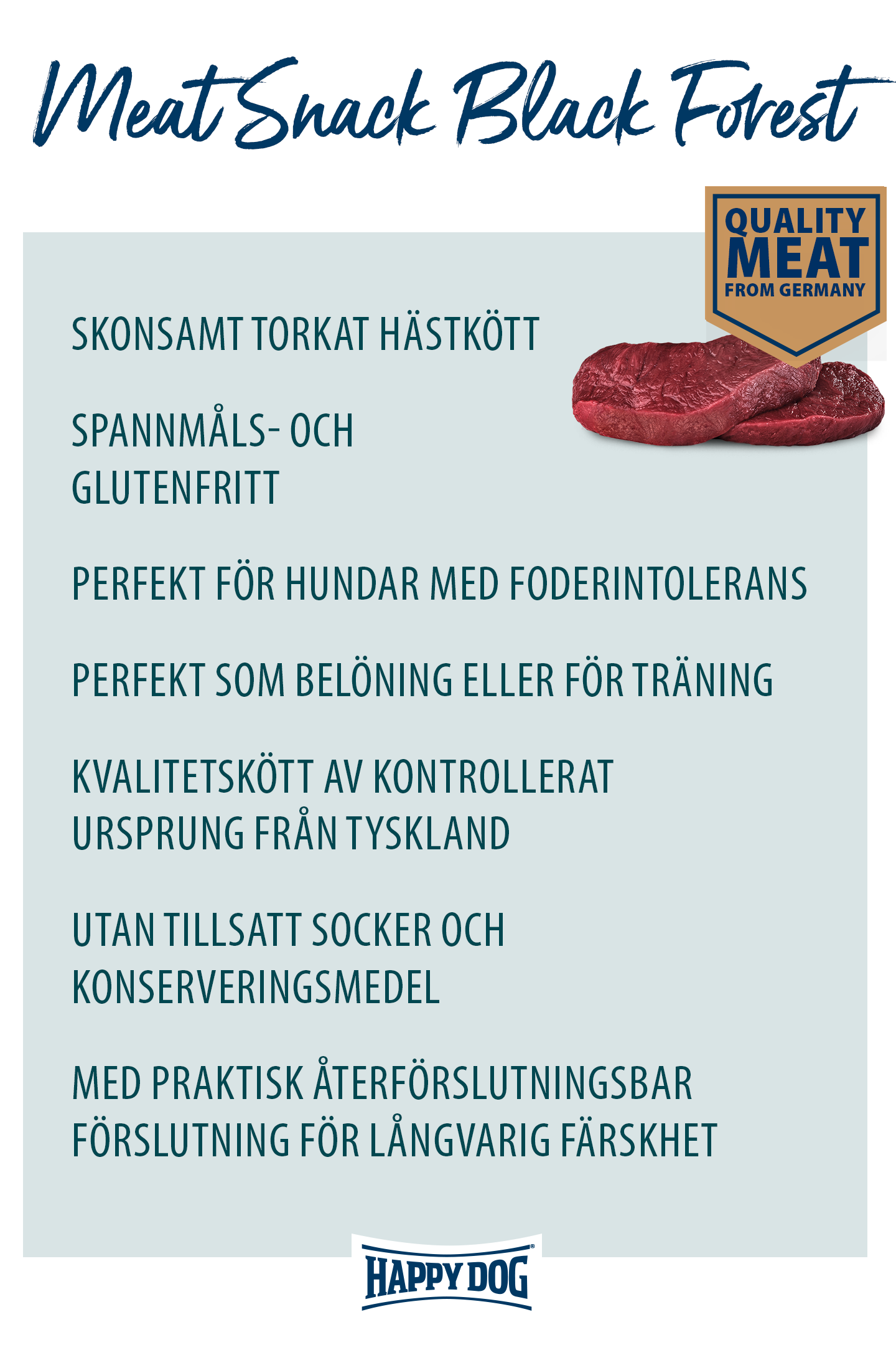 Har du en känslig fyrbent vän som inte tål allt? Då kanske våra Meat Snacks med häst är något för den! Belöna din älskling med en extra portion hästkött. Tänk dig hur ni går en promenad tillsammans i skogarna i Schwarzwald och kanske svalkar er i en av de många sjöarna.