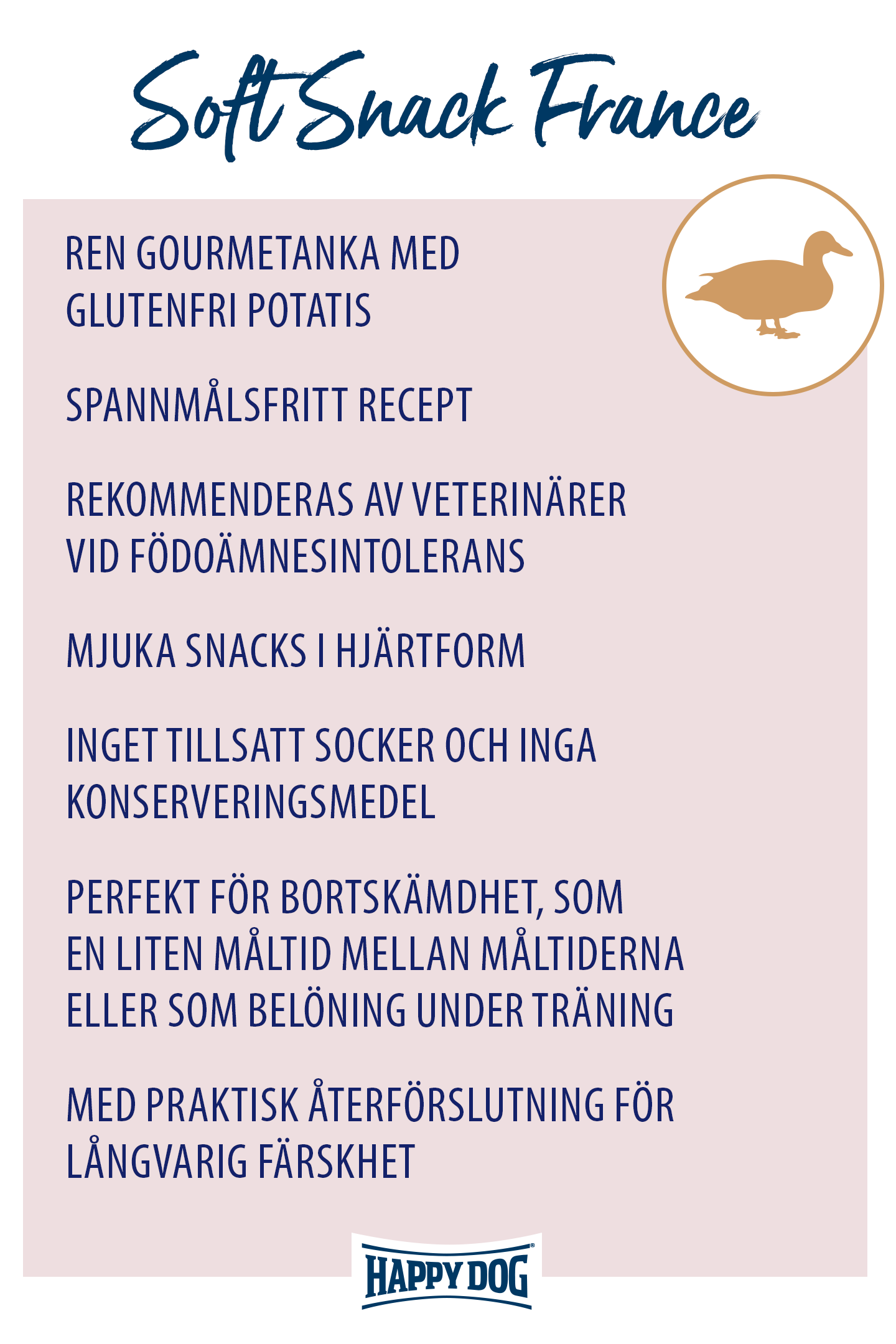 De hjärtformade Soft Snacks France passar både för att skämma bort och som en liten måltid mellan varven. Närande gourmetanka förfinad med glutenfri potatis är en riktig smakupplevelse för anspråksfulla finsmakare. Det spannmålsfria snackset är också idealiskt för känsliga och anspråksfulla hundar av medelstora och stora raser och rekommenderas av veterinärer vid foderintolerans. Självklart tillverkas snacksen utan tillsats av socker eller konserveringsmedel och har en återförslutning som garanterar långvarig färskhet. Njutningsfulla stunder av bortskämdhet garanteras!