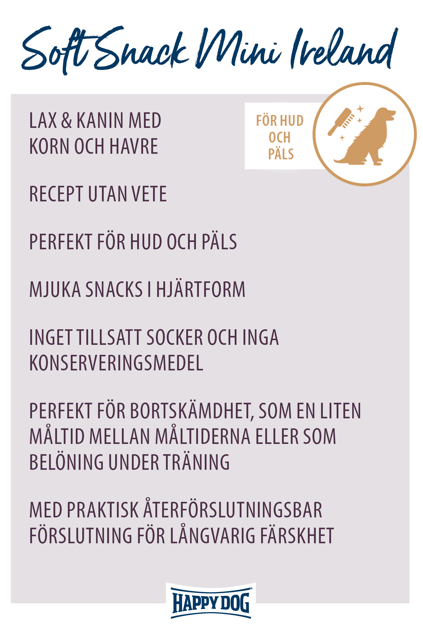 Huvudingrediensen för goda snacks bör vara kött och slaktbiprodukter av hög kvalitet, tillsammans med övriga ingredienser av bra kvalitet. Ett Soft Snack doftar mer intensivt än ett hundkex, vilket gör att acceptansen för mjuka snacks oftast är högre. Dessutom kan små munsbitar med mjuk konsistens ges enklare och snabbare än hårda kex. Detta kan vara en fördel under träning, eftersom din lilla hund inte behöver stanna upp och tugga.