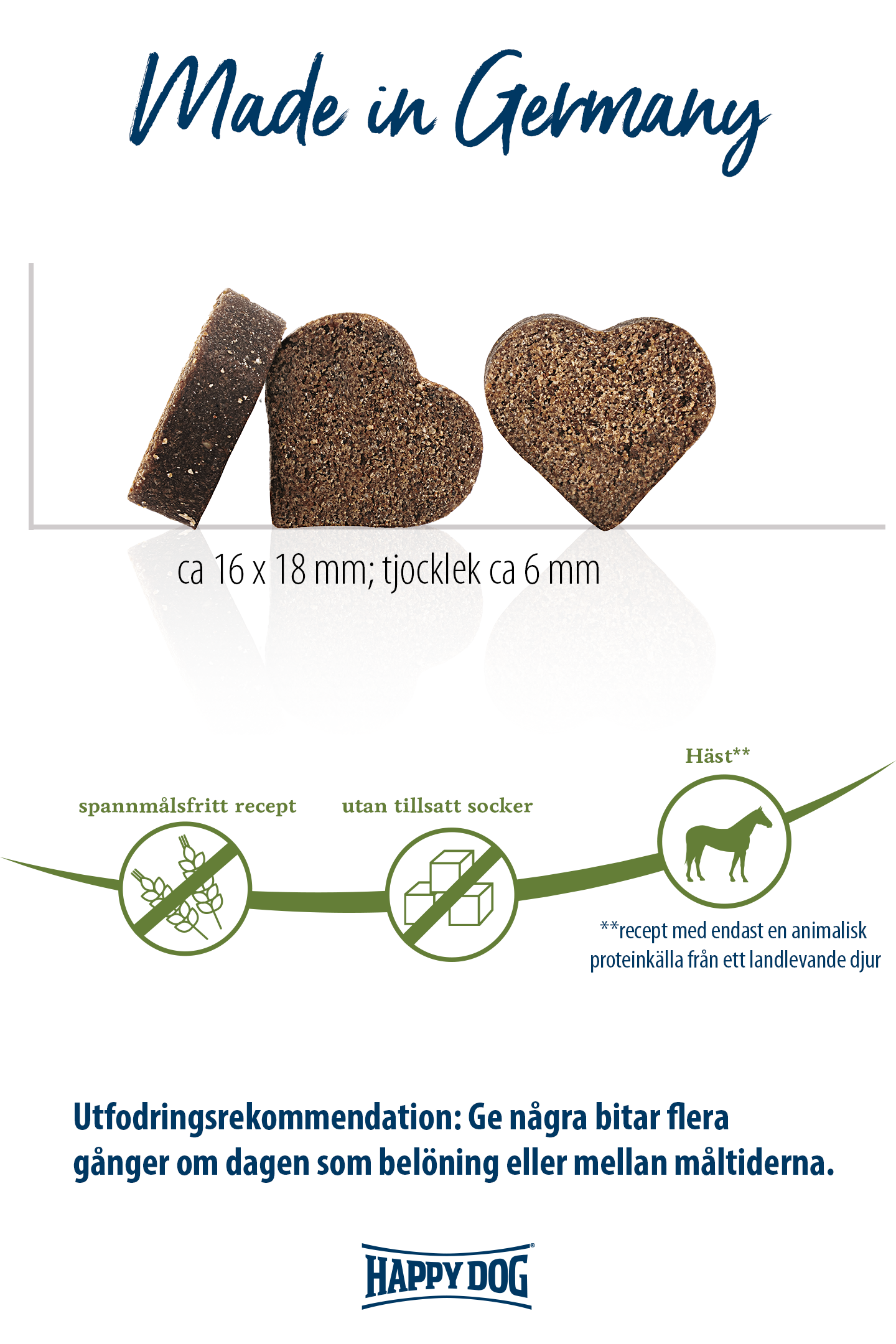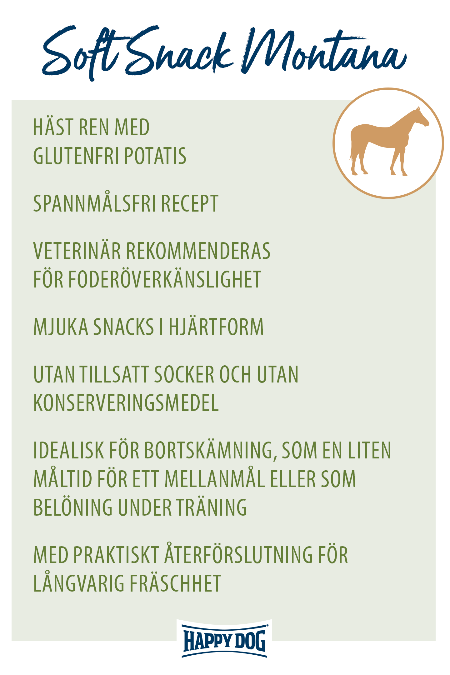 Saftigt och utsökt, det mjuka hjärtformade Snack Montana är perfekt för att skämma bort din älskling eller som en liten godbit mellan varven. Närande häst förfinad med glutenfri potatis är en riktig godbit för anspråksfulla finsmakare. Det spannmålsfria receptet är mycket bra för känsliga och kräsna hundar av medelstora och stora raser. Veterinärer rekommenderar det också vid foderintolerans. Liksom alla andra produkter tillverkas snacksen utan tillsats av socker eller konserveringsmedel och har en återförslutning för långvarig färskhet. Ge din jycke njutningsfulla stunder av bortskämdhet!