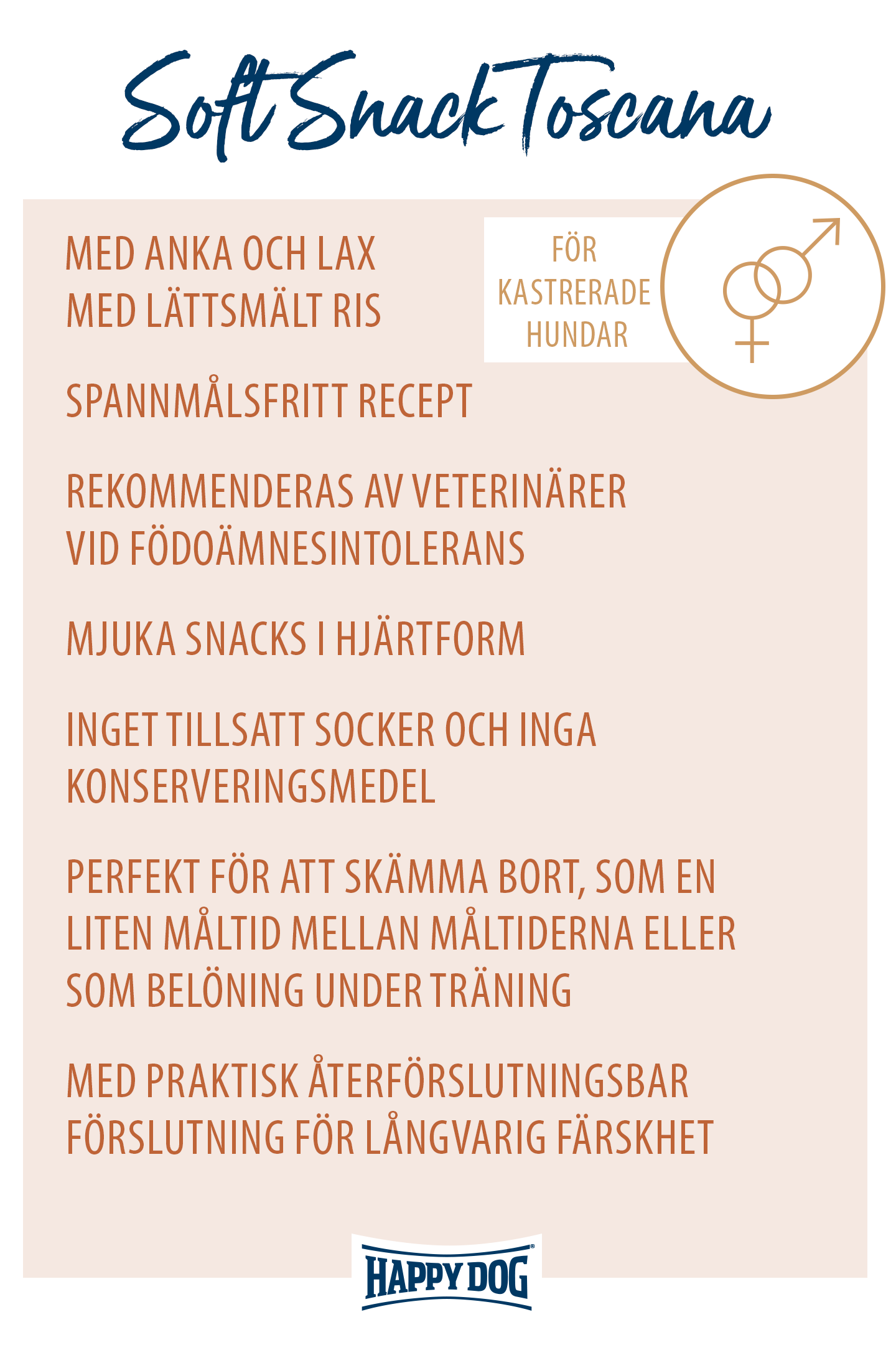 De hjärtformade Soft Snacks Toscana passar både för att skämma bort och som en liten måltid mellan varven. Lättsmält anka och ädel lax förfinade med aromatiska medelhavsörter är en smakupplevelse för anspråksfulla finsmakare. Det vetefria receptet med måttlig fetthalt är idealiskt för hundar med tendens till övervikt, kastrerade och anspråksfulla hundar av medelstora och stora raser. Detta snacks tillverkas utan tillsats av socker eller konserveringsmedel. Påsarna kan återförslutas och håller därigenom snacksen färska längre.