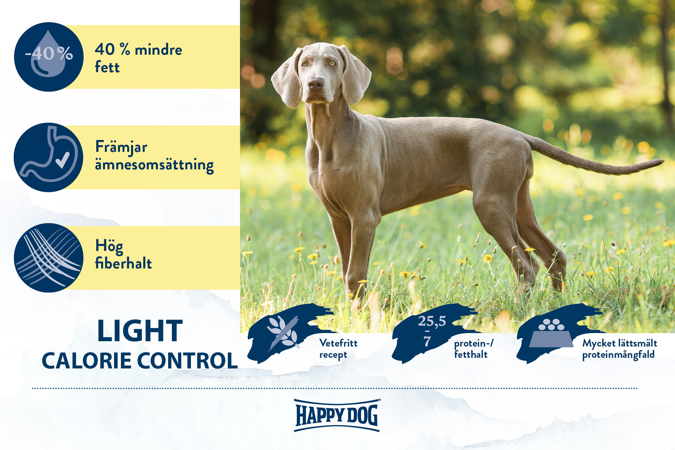 Happy Dog Fit & vital Light Calorie Control är perfekt skräddarsytt för behoven hos hundar som behöver kost med låg fetthalt för att bibehålla en god kroppskonstitution och för att hålla vikten, exempelvis efter en diet. Det utsökta, vetefria helfodret med endast 7 % fett och L-karnitin främjar ämnesomsättningen och baseras på det unika Happy Dog Natural Life Concept®. På grund av ett högt fiberinnehåll mättar torrfodret extra bra.
