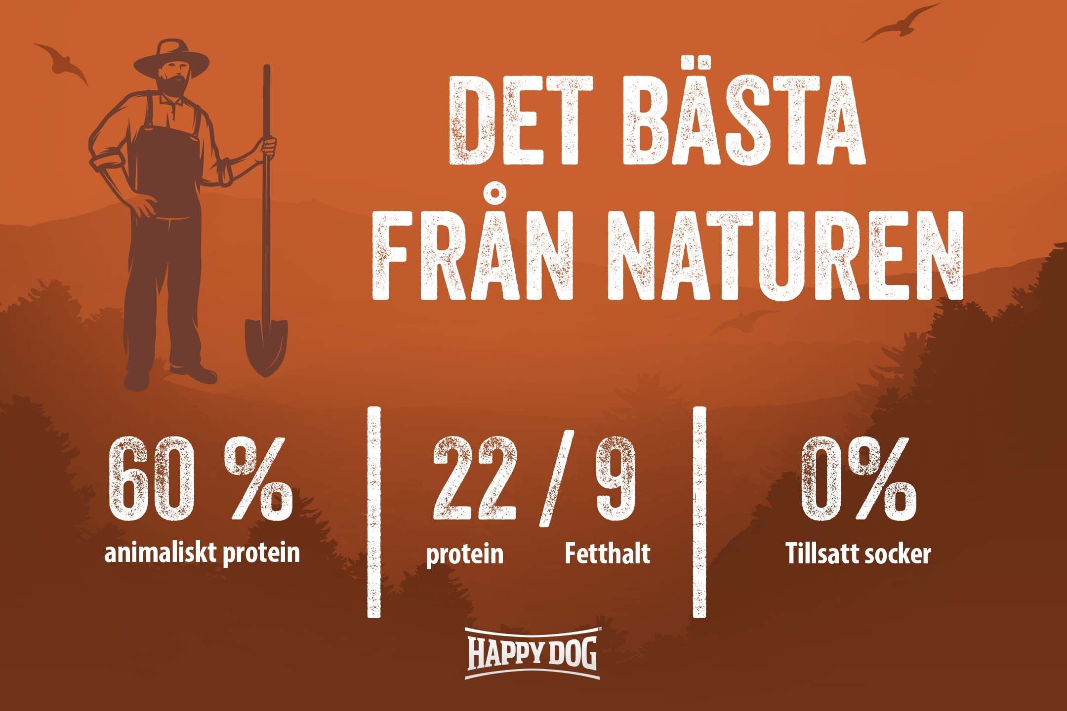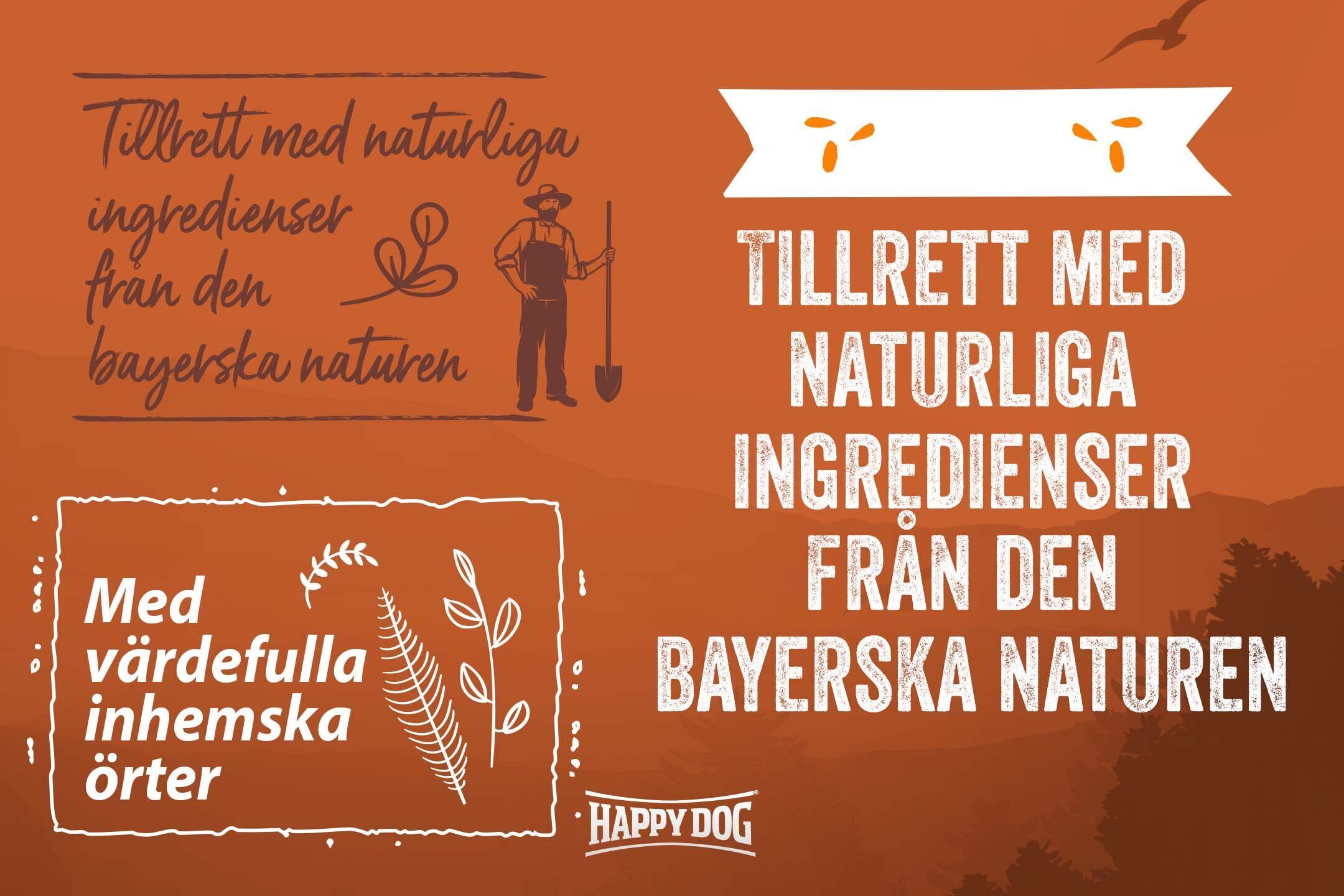 Happy Dog NaturCroq Rind & Reis är det perfekta torrfodret, med den naturliga smaken från Bayern. De hårdgräddade kroketterna innehåller ingredienser av högsta kvalitet som nötkött, mycket lättsmält ris och hälsosamt fullkorn från regionen. Nötkött ger din hund högkvalitativt animaliskt protein och ger den kraft den behöver för att leka och springa runt. Fullkornsprodukter är en av de viktigaste fiberkällorna. De ansvarar för reglering av tarmrörelsen, mättar samt främjar matsmältningen. De kan även stödja tarmhälsan. Dessutom levererar fullkornsprodukterna många B-vitaminer, mineraler, som magnesium, järn, selen och zink, och är fulla av komplexa kolhydrater. Det goda receptet förfinas med värdefulla lokala örter som ger din fyrbenta vän många värdefulla näringsämnen på ett naturligt sätt.