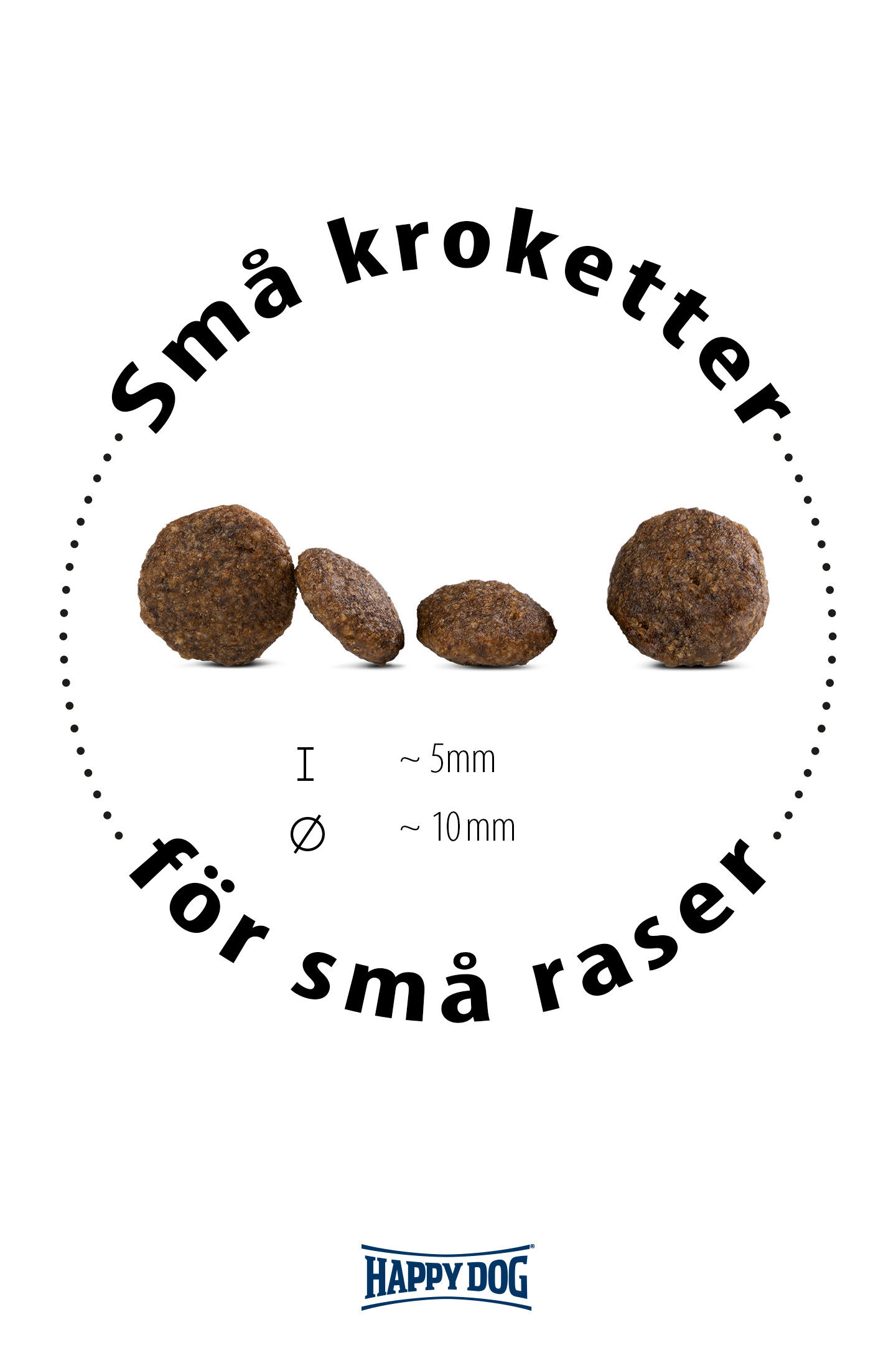 Skäm bort din lilla finsmakare med en utsökt sammansättning av finaste lax, utsökt kanin och näringsrikt lamm avrundat med glutenfri potatis. Det välsmakande och spannmålsfria receptet med något högre energiinnehåll är idealiskt för känsliga och aktiva fyrbenta vänner upp till 10 kg. De små kroketterna är optimalt anpassade till tänderna hos små hundar.