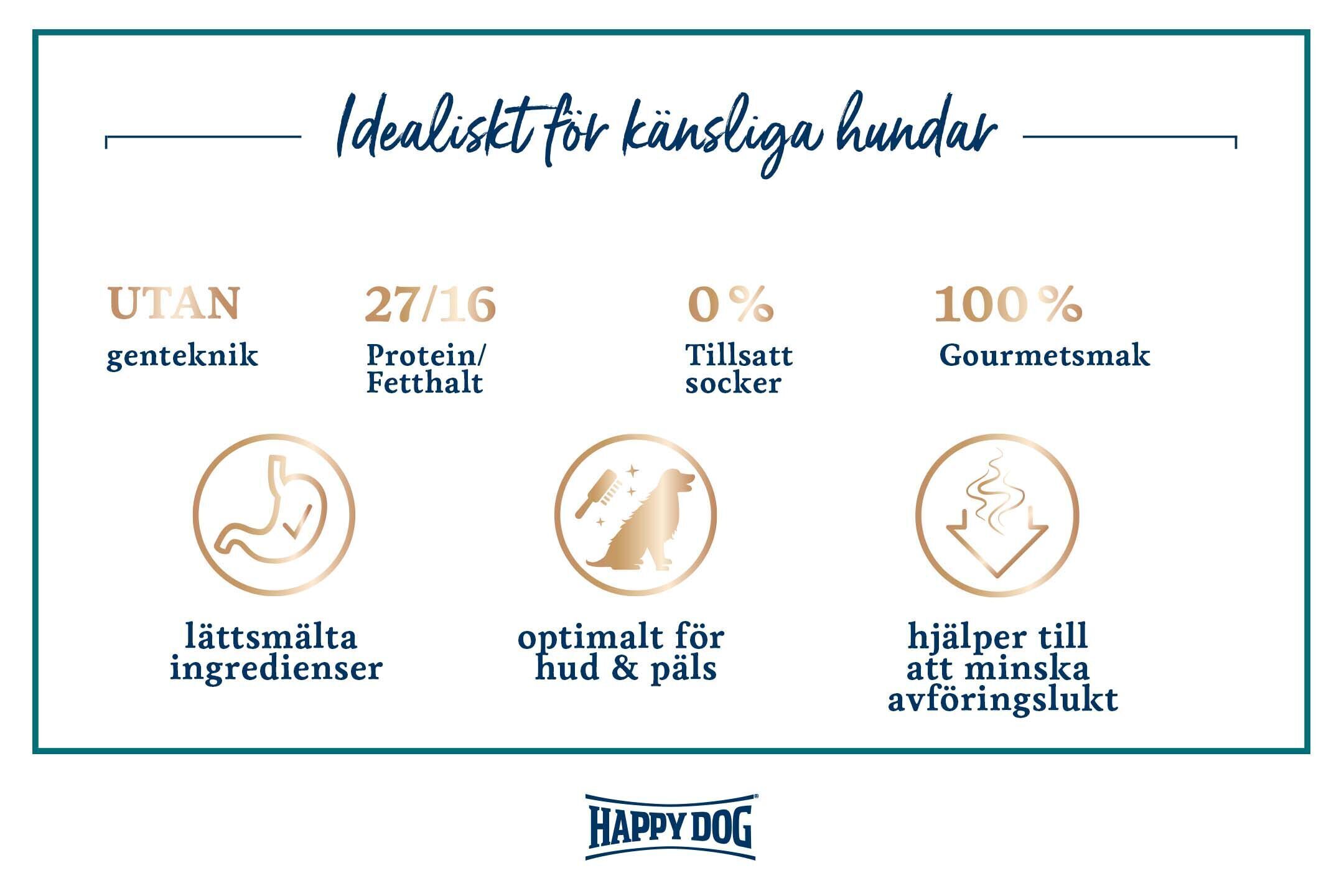 Kycklingkött* (27 %), ris, rismjöl, risprotein, fjäderfäfett, betmassa* (avsockrad), linfrö, solrosolja, äppelpressmassa* (1,3 %), hydroliserad lever, cellulosa, hydroliserad fisk*, kaliumklorid, rapsolja, majs, jäst*, natriumklorid, tång*, cikoriapulver (0,15 % = 0,1 % inulin), jästextrakt* (0,2 % = 0,016 % mannanoligosackarider), yucca schidigera* (0,1 %), musselkött*, gurkmeja (0,05 %), mjölktistel, kronärtskocka, maskros, ingefära, björkblad, nässlor, kamomill, koriander, rosmarin, salvia, lakritsrot, timjan (totalt torkade örter: 0,16 %);