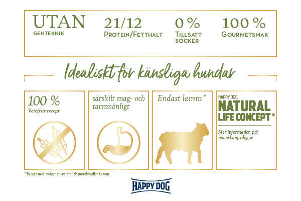 Erbjud din fyrbenta vän en smakhöjdpunkt med den lättsmälta sammansättningen från Happy Dog Neuseeland. En riktig godbit, som är särskilt mag- och tarmvänlig tack vare det lättsmälta lammet och det glutenfria receptet. Noggrant utvalda, helt naturliga ingredienser gör produkten extremt god och lättsmält för din älskling. Baserat på det unika Happy Dog Natural Life Concept® stödjer nyzeeländsk mussla lederna och värdefulla omega-3- och omega-6-fettsyror säkerställer en glänsande päls.