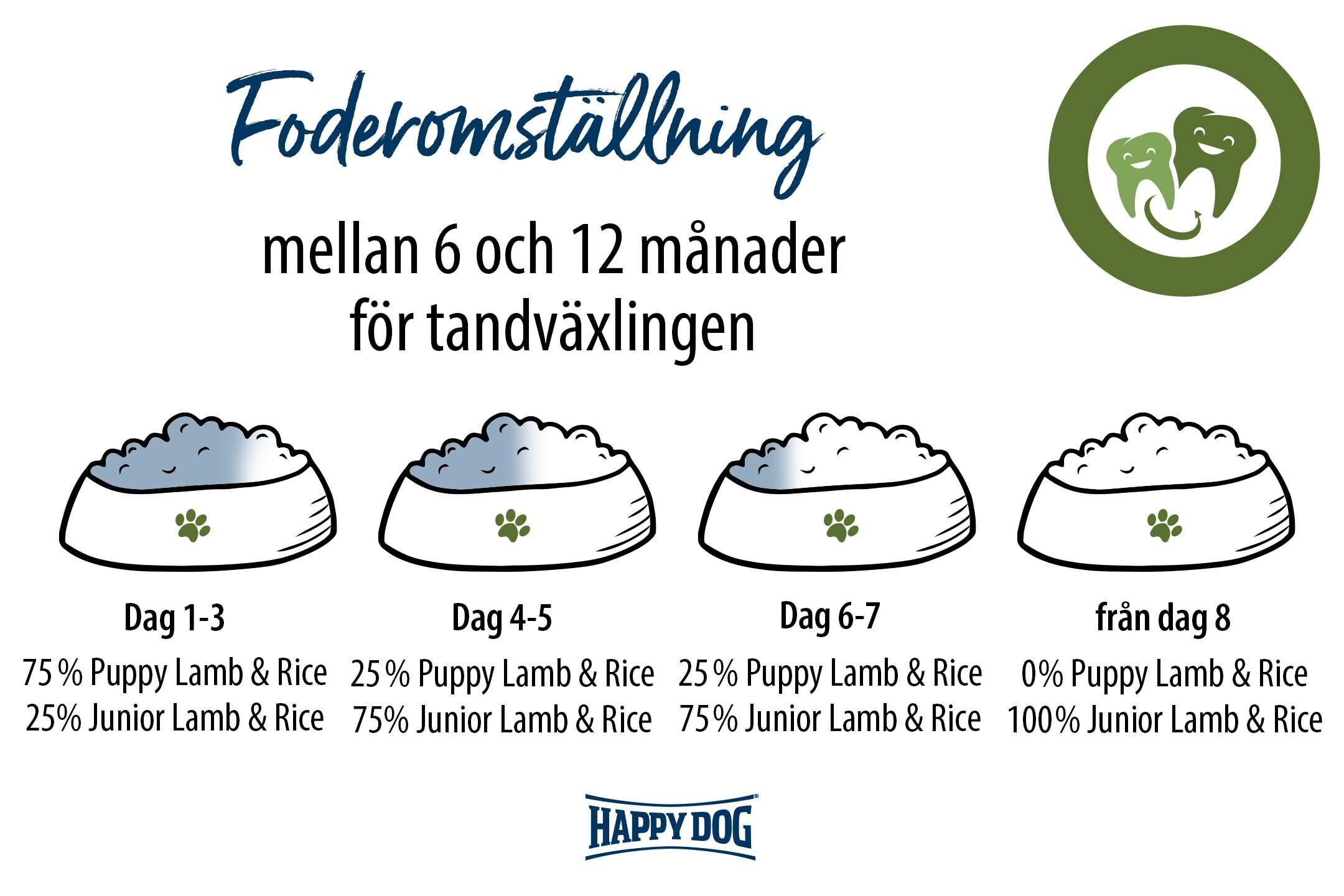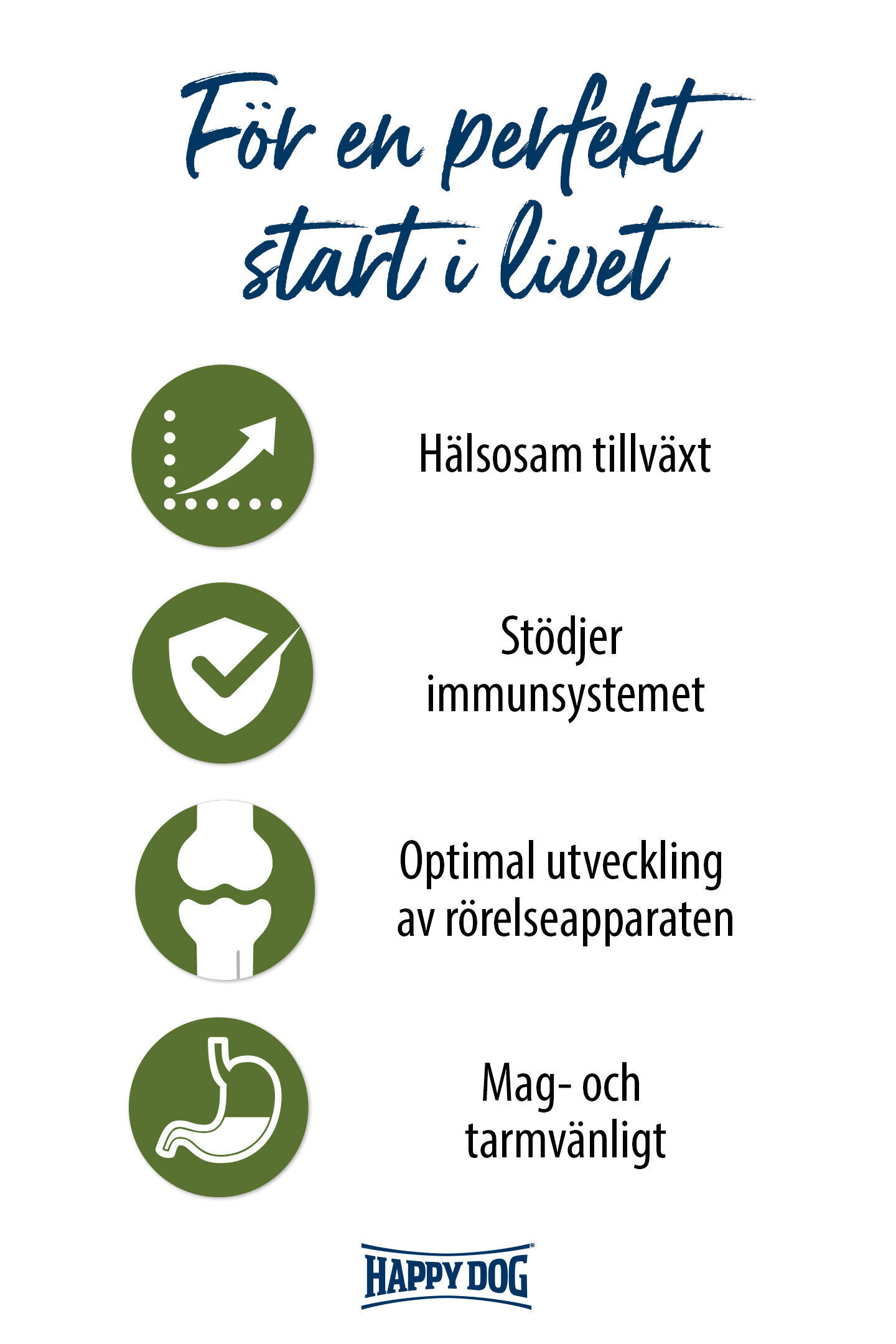 Happy Dog Sensible Puppy med vältolererat lamm och lättsmält ris är perfekt anpassat till behovet hos valpar från 1 månads ålder och framåt. Med sitt fågelfria recept är Sensible Puppy även väldigt passande för känsliga hundar. En balanserad diet med värdefull nyzeeländsk grönläppad mussla och c-vitamin stödjer optimal utveckling. Baserat på Happy Dog Natural Life Concept® får din fyrbenta vän allt den behöver för att gynna sin kropp på ett holistiskt sätt, vilket ger den en bekymmersfri start på ett långt och hälsosamt liv. Från 7 månader och framåt bör du sakta börja byta foder åt din valp till Happy Dog Sensible Junior Lamm & Ris. Under unghundsfasen växer din hund långsammare och kräver en mindre omfattande diet.