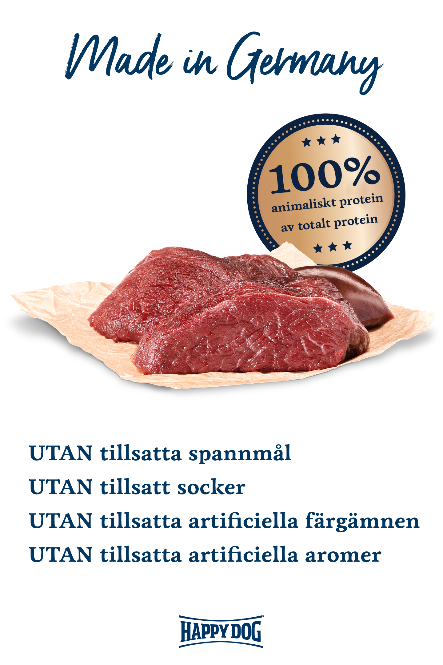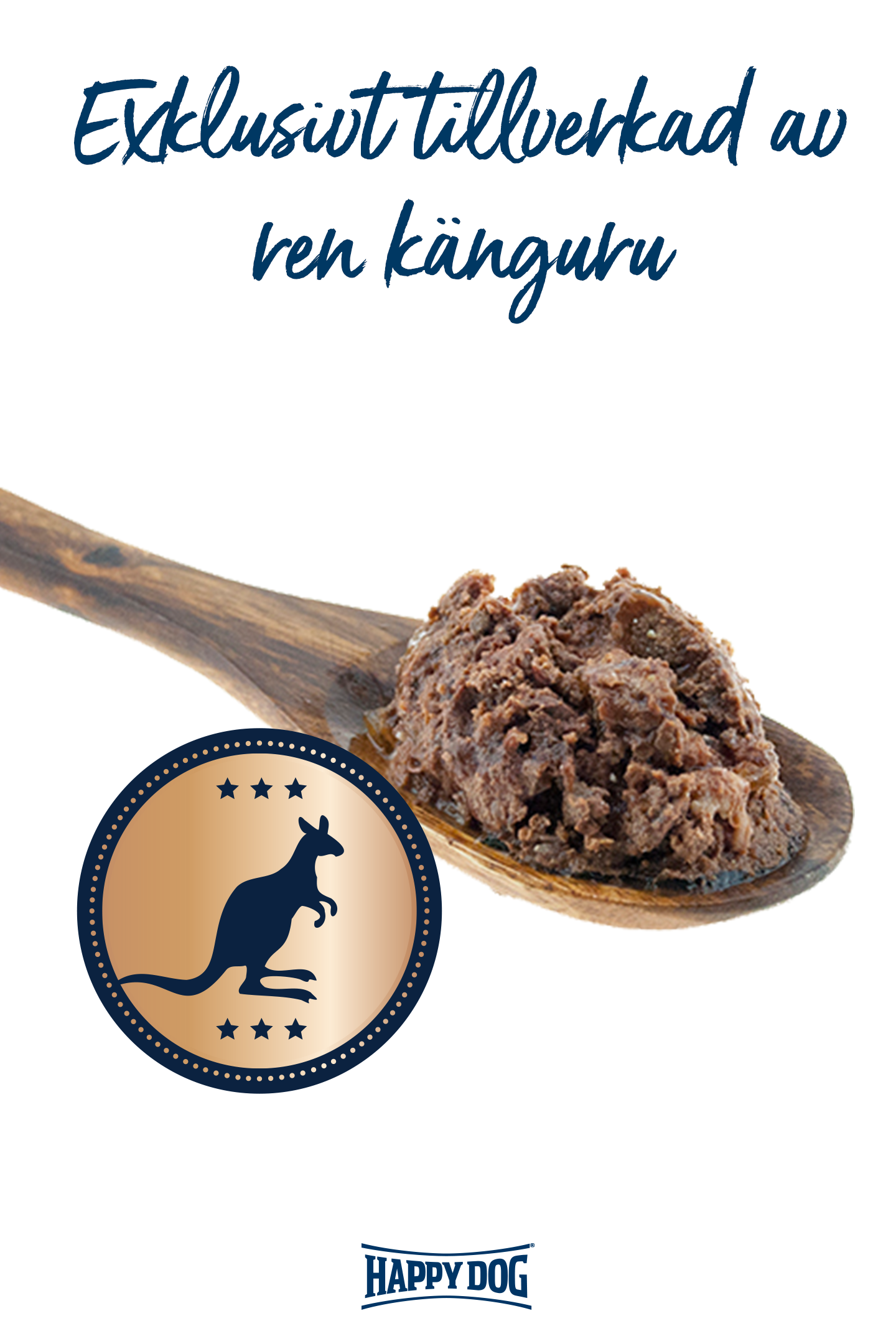 Burkfodret Happy Dog Sensible Pure Australia består till 100 % av närande känguru och är idealiskt för vuxna djur av alla hundraser och för känsliga hundar med foderintolerans.