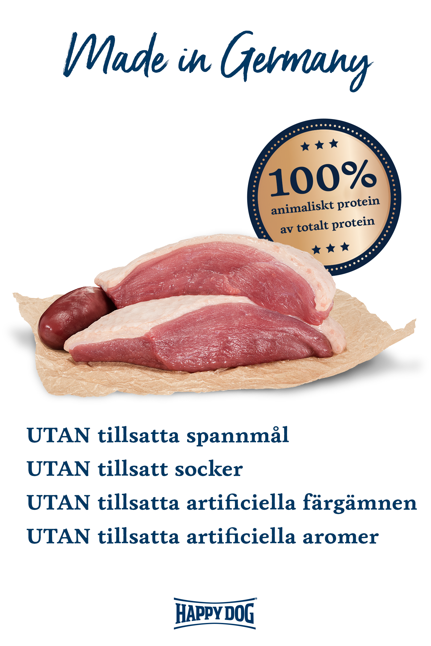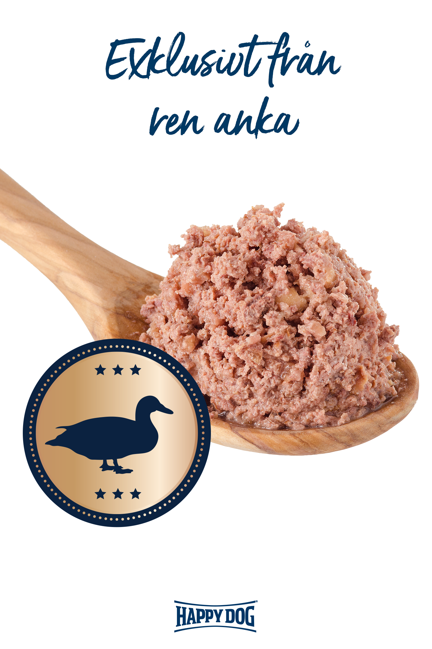 Fyll din hunds matskål med Happy Dog Sensible Pure France, ett rent köttfoder som till 100 % består av det bästa köttet och slaktbiprodukterna uteslutande från anka. Med vår våtfoder kan du mata din fyrbenta vän artanpassat. Naturligtvis tillsätts ingen soja, socker eller konstgjorda färg- eller smakämnen.