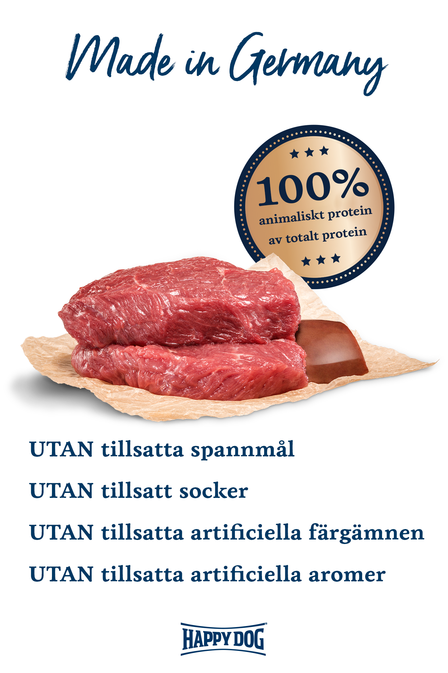 Det rena köttfodret är perfekt som enda foder samt för självgjorda delikatesser och kan perfekt kombineras med Happy Dog Flocken Mixer. Flocken Mixer är en hälsosam kost med viktiga fibrer från grönsaker för att stödja matsmältning och kolhydrater som energileverantör.